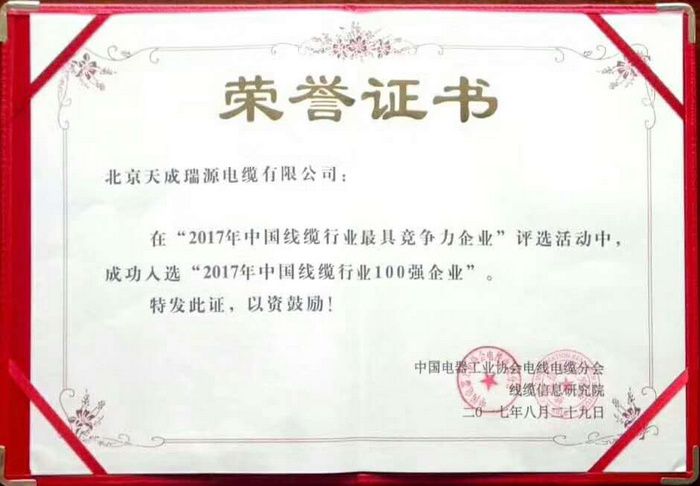 大(dà)會(huì)以“提質量、強防範、樹品牌”爲主題,揭曉了“中國(guó)線纜行(xíng)業(yè)最具競争力企業(yè)10強”和“中國(guó)線纜行(xíng)業(yè)100強企業(yè)”等榜單。中建特纜(北京)電纜有限公司憑着良好的産品質量、美譽度以及綜合實力等優勢,獲得中國(guó)電(diàn)器工(gōng)業(yè)協會(huì)和電(diàn)纜信息研究院共同頒發的“2017年中國(guó)線纜行(xíng)業(yè)100強企業(yè)”榮譽證書(shū)。并排名55名!!